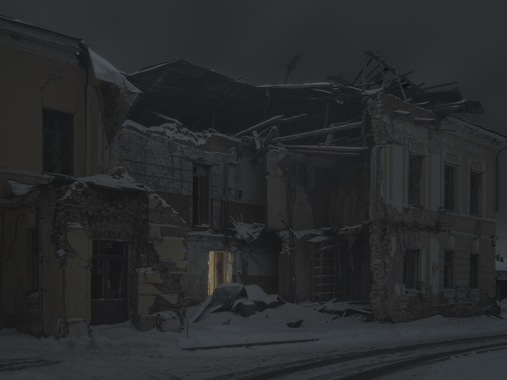 З лютого 2022 року Україна занурена в жорстоку війну, що спустошує її територію. Усюди простягаються сліди руйнування: розірвані будівлі, обвалені дахи, розколоті стіни, меблі, розкидані, як уламки зруйнованих життів. Ці руїни — німі свідки хаосу, відлуння життя, жорстоко перерваного вибухами снарядів, дронів, ракет.